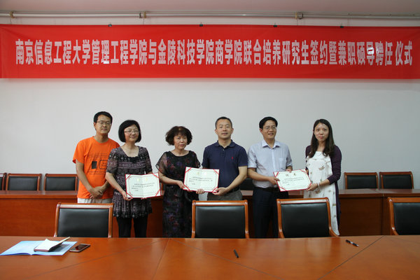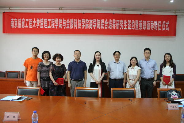 与南京信息工程大学管理工程学院联合培养硕士研究生签约暨兼职硕导聘任仪式在学术交流中心举行。南京信息工程大学管理工程学院院长巩在武、书记刘军、院长助理于小兵、院办主任王俊,P站视频