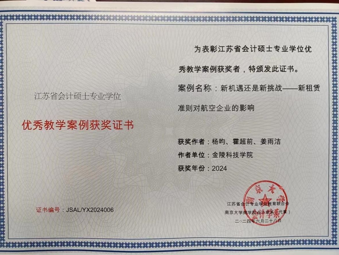 杨昀教授负责的团队荣获江苏省首届会计专硕教学案例优秀案例。
