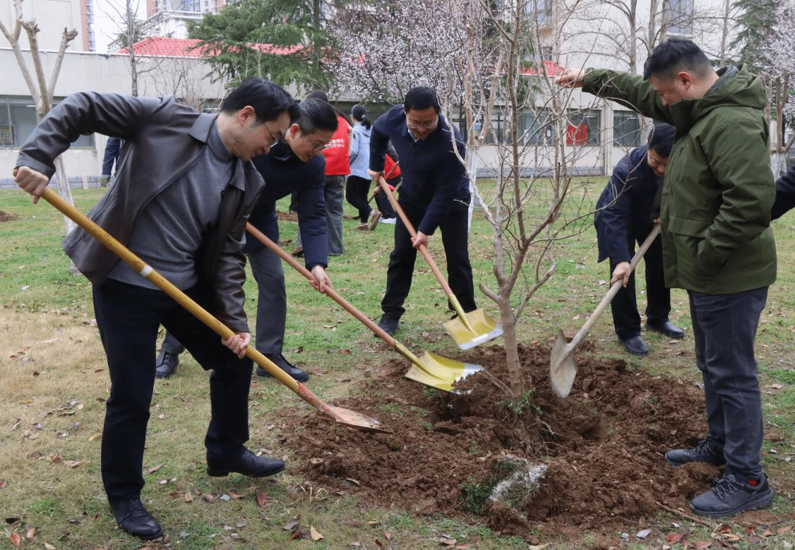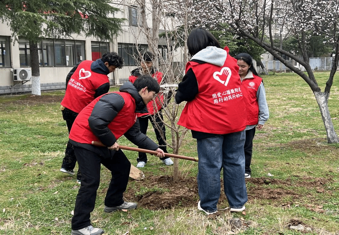 领导班子成员带头挥锹填土,师生党员配合默契地扶苗浇水。