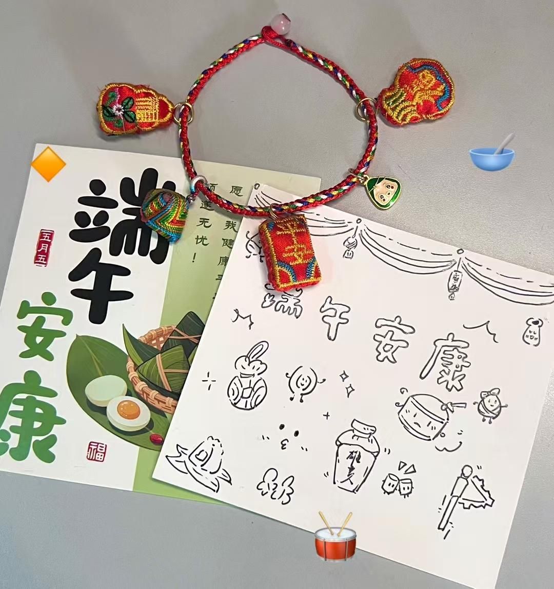 编织五彩绳同样精彩。五彩绳寓意祈福纳吉,同学们在老师的指导下,认真学习传统结绳技艺。他们全神贯注,手指灵活地穿梭在彩绳之间,将对生活的美好期许编织其中。彩线穿梭间,平安结、小粽子等造型精美、寓意吉祥的彩绳逐渐成型。大家相互交流编织技巧,感受着传统手工艺的独特魅力,在一针一线中传承着千年非遗文化。这一根根亲手编织、传递着温暖话语的彩绳,不仅缠绕在腕间,更将各民族学生的心紧紧联结,成为增进各民族学生交往交流交融的有形纽带,无声地诉说着“美美与共”的和谐乐章。