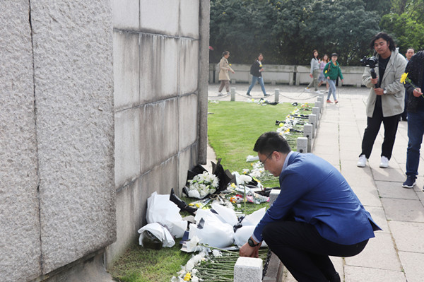 下午14:00许,雨花台烈士纪念碑前,全体党员师生们庄严肃立,为雨花英烈敬献花圈,P站视频