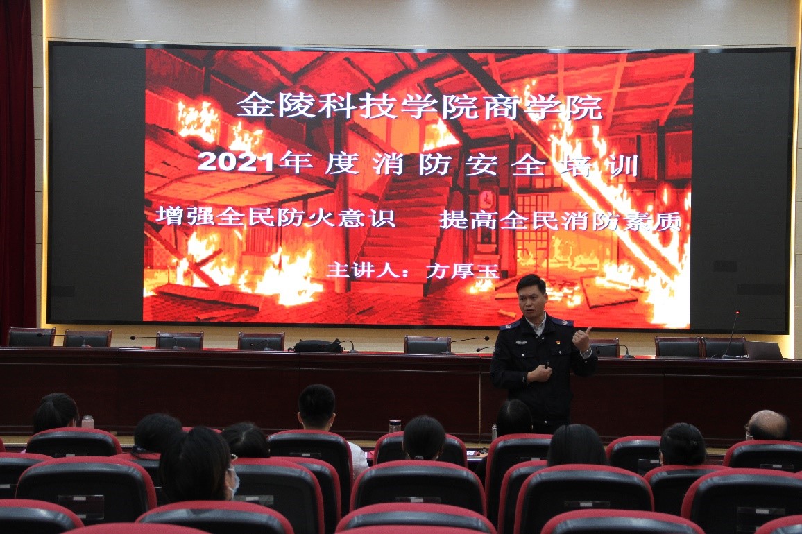 在科技楼报告厅,进行主题为“增强全民防火意识,提高全民消防素质”的消防安全专场宣讲。