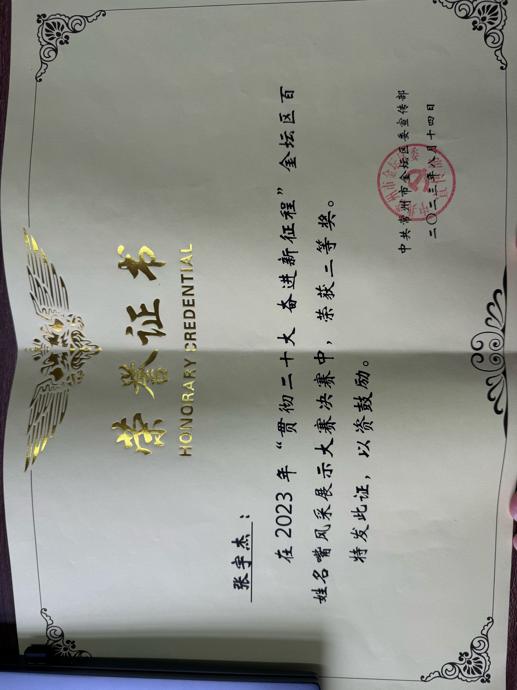 张宇杰,男,中共党员。2022届国际经济与贸易毕业生,江苏省常州市某区某乡镇财政审计局一级科员,中共党员。大学期间, 成绩优异,参加2022年国家公务员考试、2022年江苏省公务员考试、2022年乡村振兴志愿者计划考试,三场考试岗位排名第一。工作以来,积极参加各类活动,获区2023年“贯彻二十大·奋进新征程”理论宣讲大赛一等奖、区“学习新思想·奋勇建新功”沉浸式党课大赛二等奖、区二十大精神知识竞赛一等奖、2023年区优秀共青团员、2023年区新录用公务员优秀学员等荣誉;积极撰写网评文章,在共产党员网、中国网、交汇点新闻累计投稿共9篇。