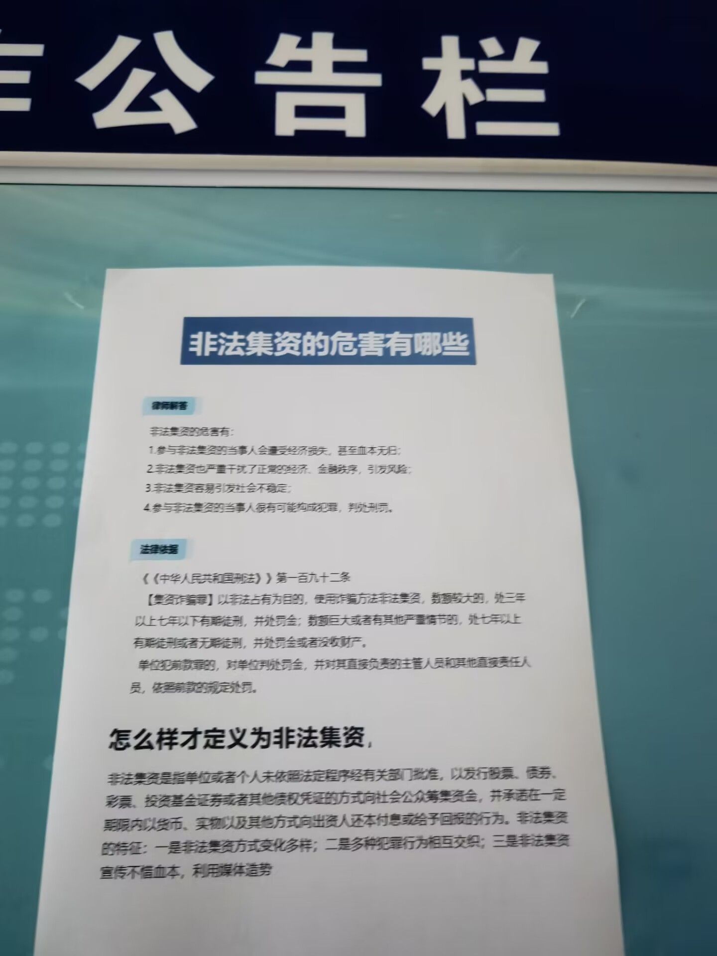 广泛利用各类平台进行防范非法集资相关知识的宣传,如在公告栏粘贴宣传单普及相关知识,提高大家的防范意识和识别能力。