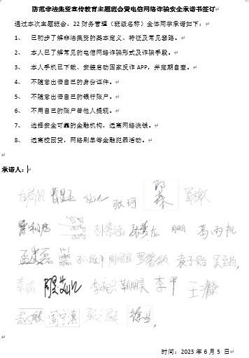 各班级在组织召开的非法集资主题班会的同时也组织大家学习了防范电信网络诈骗安全相关知识,并且签订了安全承诺书。
