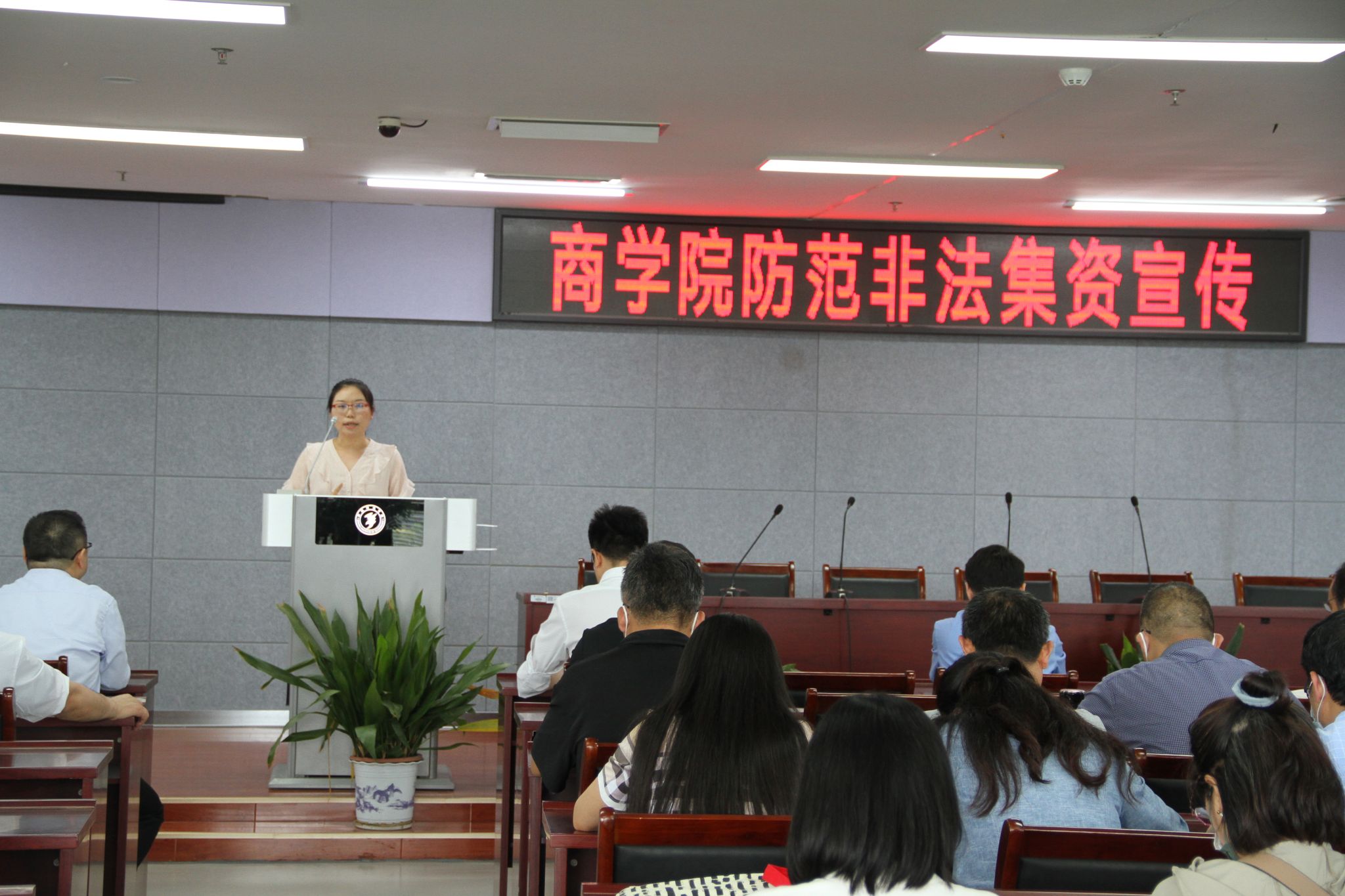 安全联络员嵇坚,根据《防范和处置非法集资条例》有关内容,向老师们介绍了非法集资的主要手段、常见套路和表现形式,非法集资的危害,非法集资人的法律责任,以及应该如何防范非法集资等。
