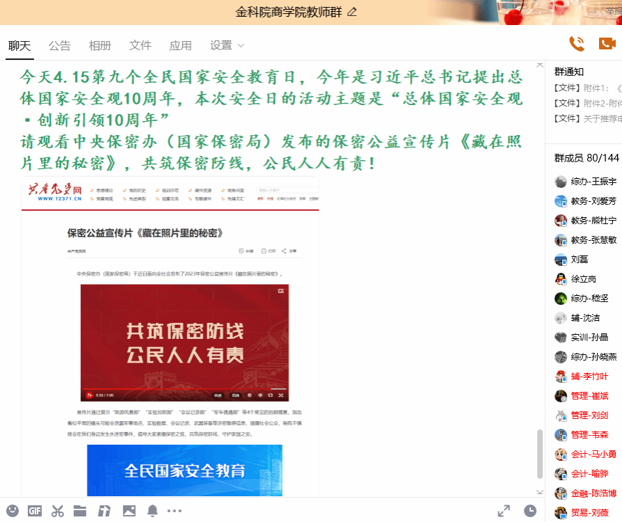 通过教师QQ群、微信群等各类平台,宣传国家安全相关知识,组织老师结合学科专业特色,在课堂内外组织学生开展国家安全宣传教育活动,宣传推广中央保密办(国家保密局)发布的保密公益宣传片《藏在照片里的秘密》。通过宣传教育,号召广大师生坚定维护国家政权安全、制度安全、意识形态安全,营造国家安全人人参与、人人有责的浓厚氛围。