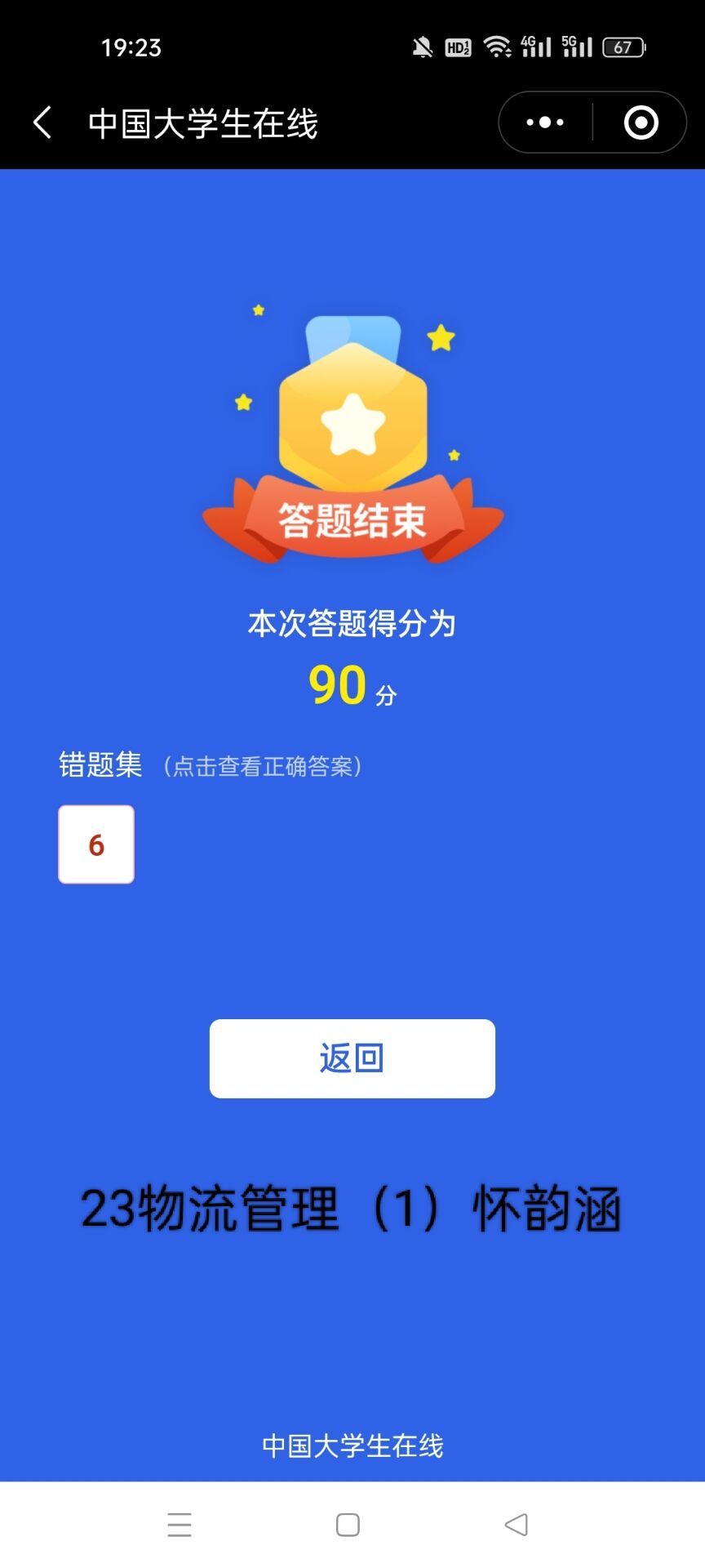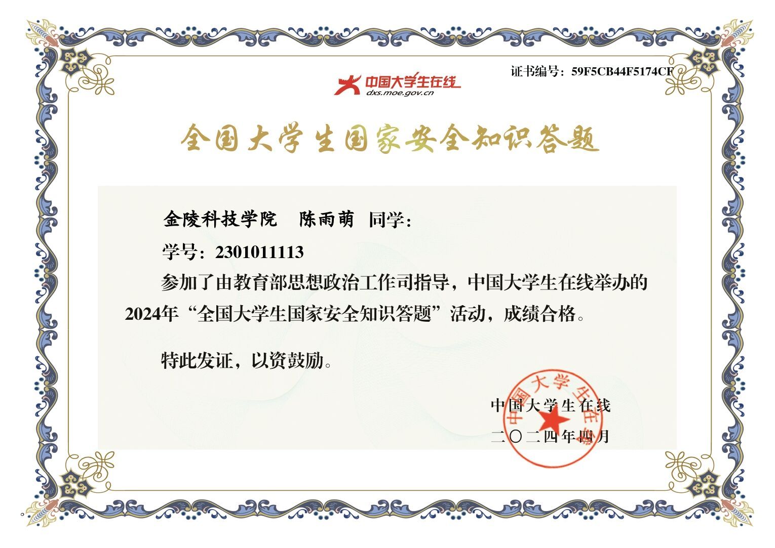 4月10日至4月17日期间,组织各班级参与中国大学生在线网站(//dxs.moe.gov.cn)或微信公众号开展"全国大学生国家安全知识答题”。部分截图如下: