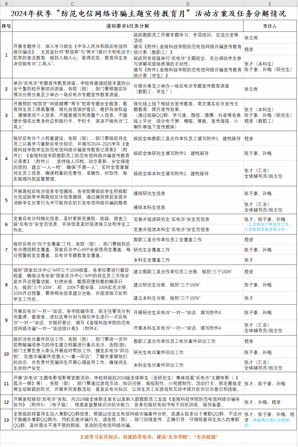 防范电信网络诈骗工作领导小组对“防范电信网络诈骗主题宣传教育月”的活动和工作进行任务分解,落实各项工作到具体负责人,以分别对教职工(含合作单位员工)、学生(含研究生、本科生)开展反诈宣传教育。