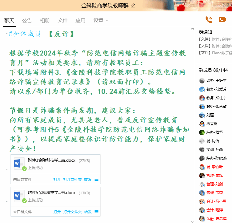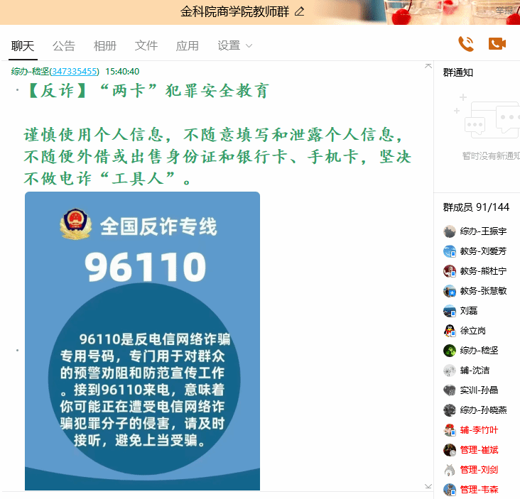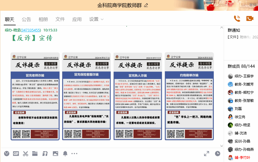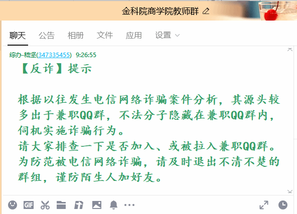 教师、合作单位员工QQ工作群,提醒老师们提高警惕,做好防范。