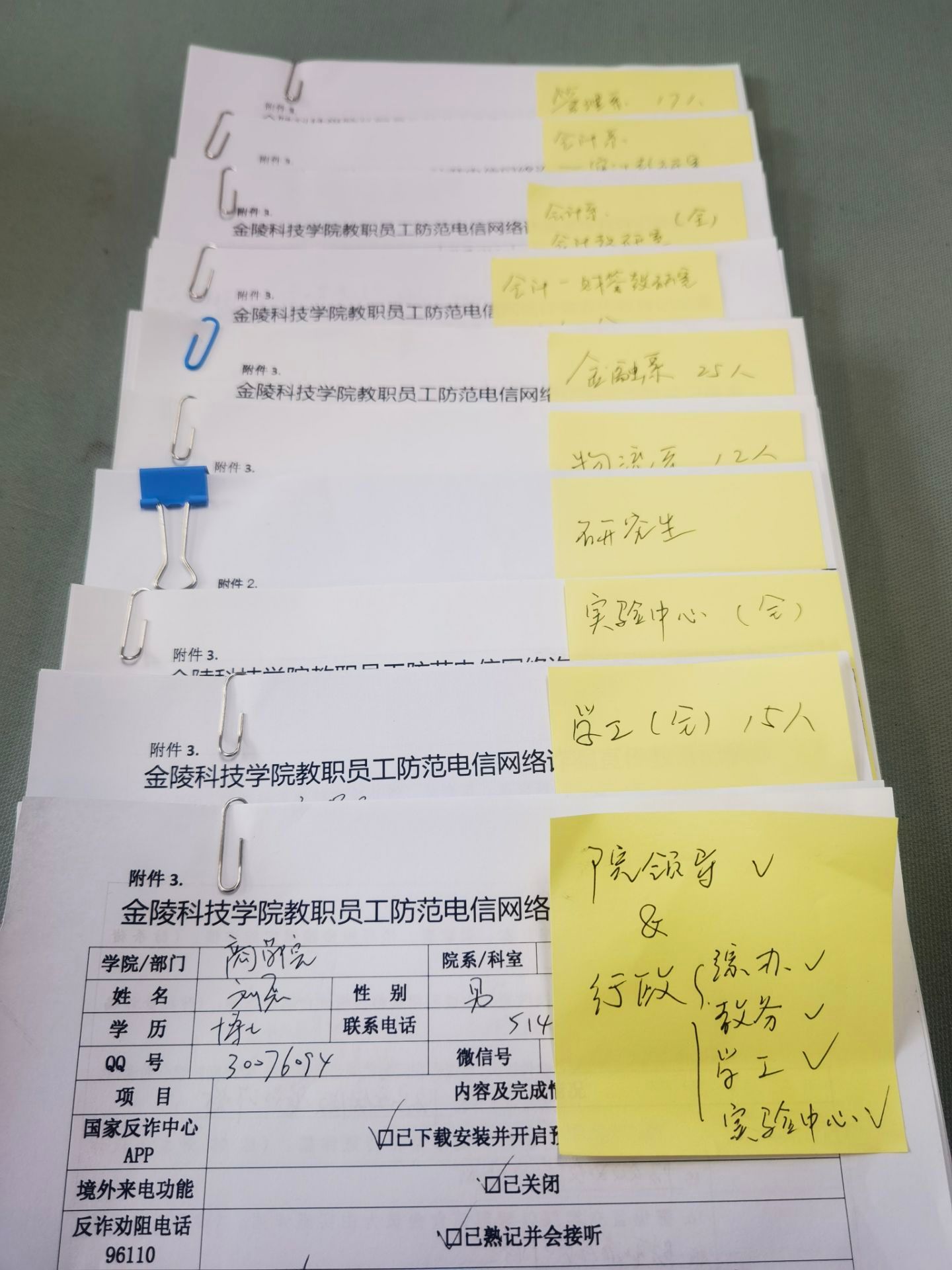 教职员工防范电信网络诈骗宣传教育记录表》,提醒教职工向家庭成员,尤其是老人普及反诈宣传教育。目前已收齐全院员工的宣传教育记录表,做好台账管理。
