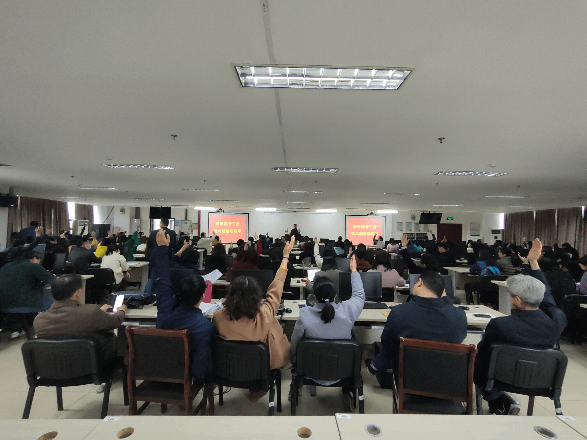 在科技楼3号楼313报告厅举行六届一次教职工大会,全体院领导、全体教工120余人参加了活动。会议由周骏书记主持。
