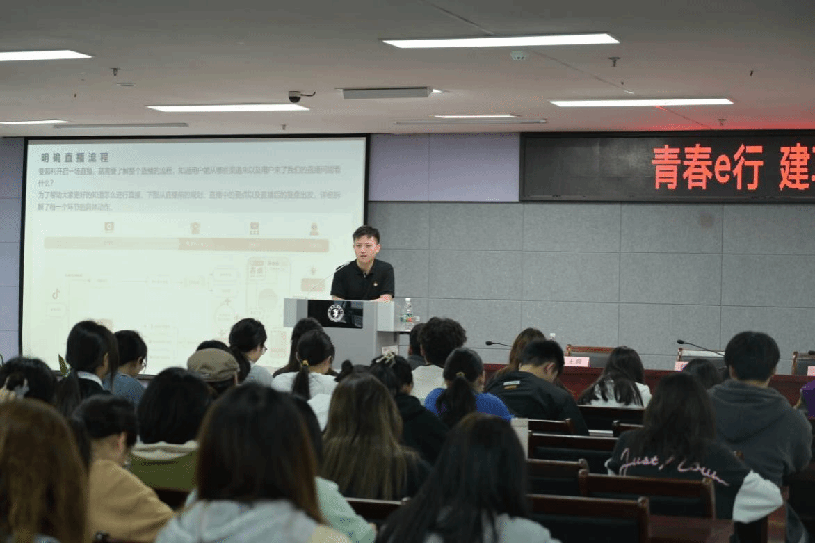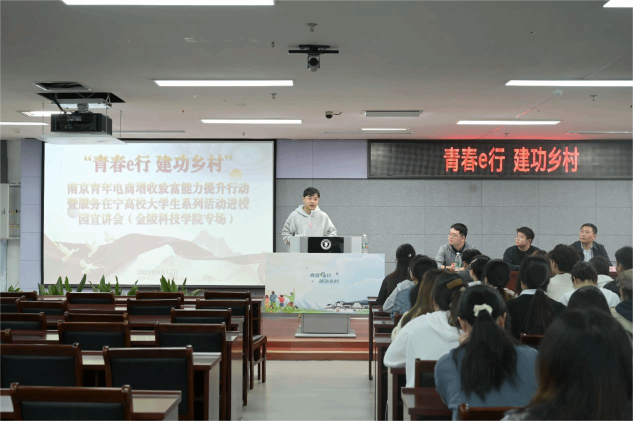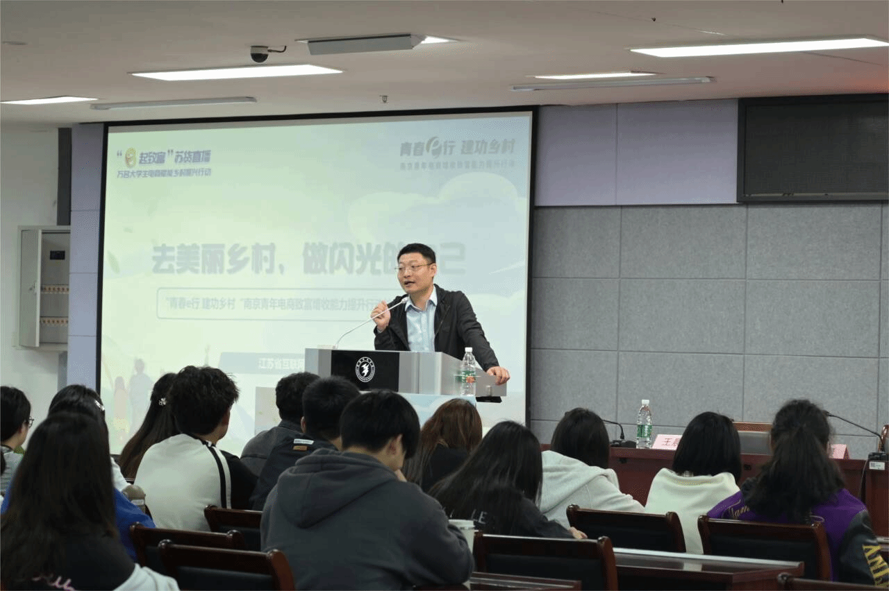表示欢迎。孙亮副书记指出活动旨在通过电商手段,引导广大青年学生积极投身乡村建设,用青春的智慧和才干为乡村振兴贡献自己的力量。随后团区委权发部胡克涵向学生讲解了“宁青驿站”的政策。微微一笑传媒有限公司董事长、南京行知微笑学堂院长谢恒义在会上介绍了近两年南京“青春e行”活动的主要成果和内容。宣讲会后,青年电商实训营公益讲师宋子文为现场同学做电商技能培训。