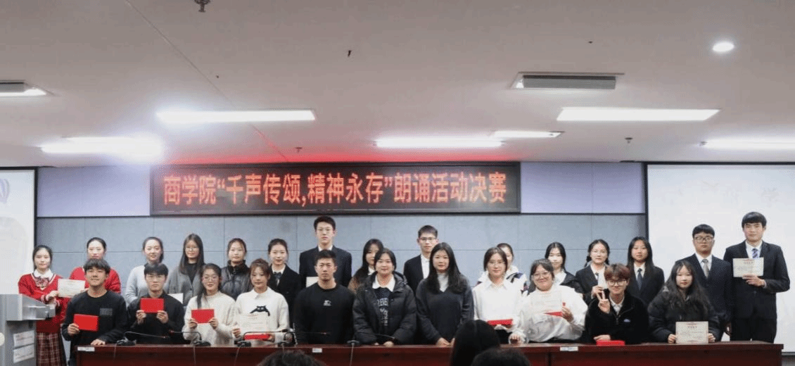 本次朗诵活动以“中国精神”为主题自定内容,比赛过程中,选手以独特的嗓音和饱满的情感将每一篇作品诠释的淋漓尽致,深深地震撼到观众们的心灵,赢得了评委与观众热烈的掌声。颁奖仪式上,共有两支团队脱颖而出,荣获一等奖,分别是杨蕾等同学带来的《百年正青春》、王一多等同学带来的《盛世中国》,此外还设有二等奖3名,三等奖5名。