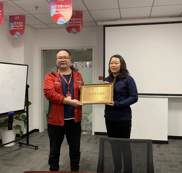 实习同学们举办欢送会,赵经理结合实习中同学们工作表现对大家职业发展提出期望和祝愿,姚老师表达对京东物流的感谢并对同学们的实习工作提出意见和建议。会上,赵经理代表京东物流南京片区管理部为学校颁发了“优秀实习团体”牌匾,并和大家一起分享代表祝福的蛋糕。