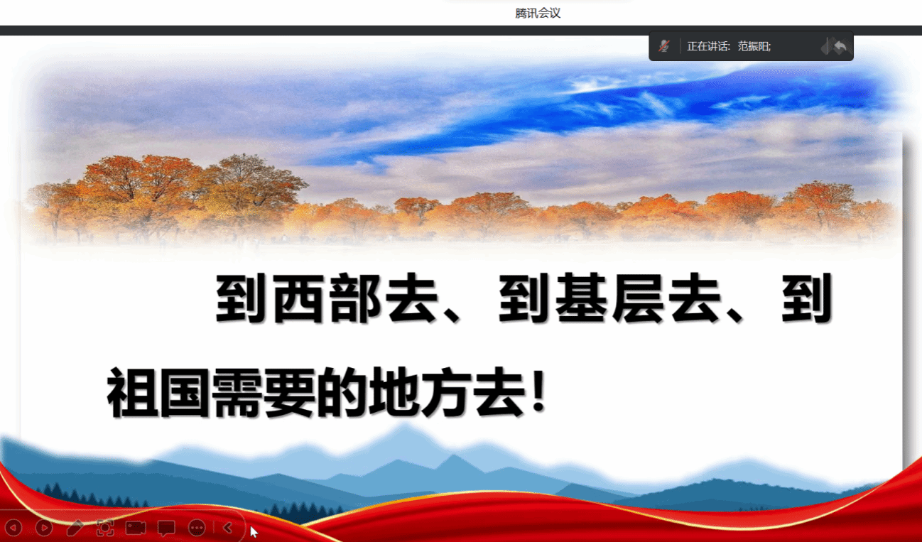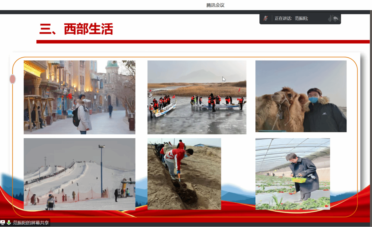 会议中,2018级财务管理专业范振阳、物流管理专业陈能干、国际经济与贸易专业罗闰这三位同学分享了他们参与西部计划的志愿者经历。三位志愿者通过图片、视频等生动的方式,就计划简介、招募事宜、政策保障、服务管理等多层次解读相关政策,从工作环境、工作待遇、人文情怀等多角度讲解在职经历,对热血青春、机遇成长、责任担当等多方面分享个人经验,并鼓励应届毕业生积极报名参与2023年西部计划。