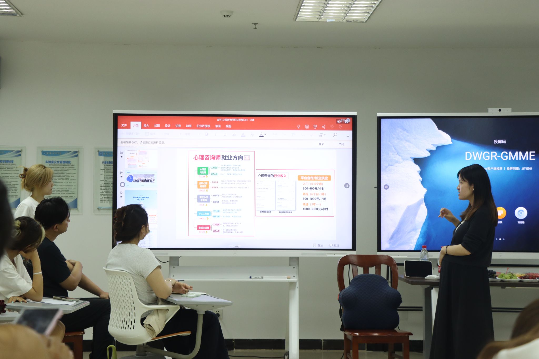 最后,两位老师还向同学们介绍了心理咨询师工作及其未来职业发展前景,满足了对心理行业有好奇心的同学,同时也为对未来迷茫的同学开拓了思路。