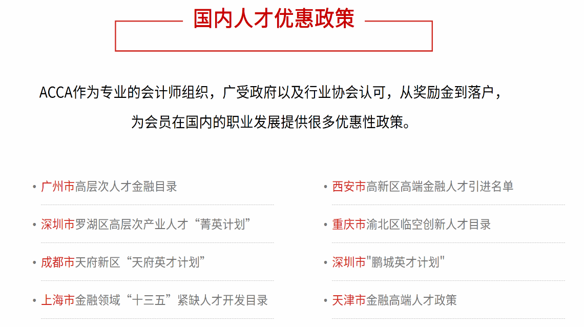 5、全国各大城市将ACCA纳入高端金融人才发展计划,享受落户、补贴等福利(包含但不仅限于以下地区)。